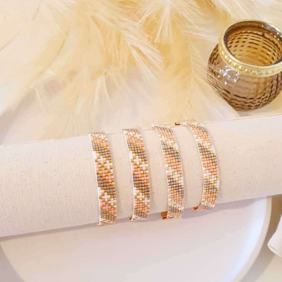 Dit armband met goud-kleurige en nude kleur kralen is handgemaakt met de bekende fijne kraaltjes van het merk Miyuki. Het bijzonder mooie armbandje is een absolute musthave in je armbanden stash. De kleuren en het ontwerp zijn een perfecte combinatie voor een stijlvol resultaat. Het verfijnde ontwerp van dit geweven armband is een bestseller. Een bijzonder mooi armbandje voor die ene speciale outfit!